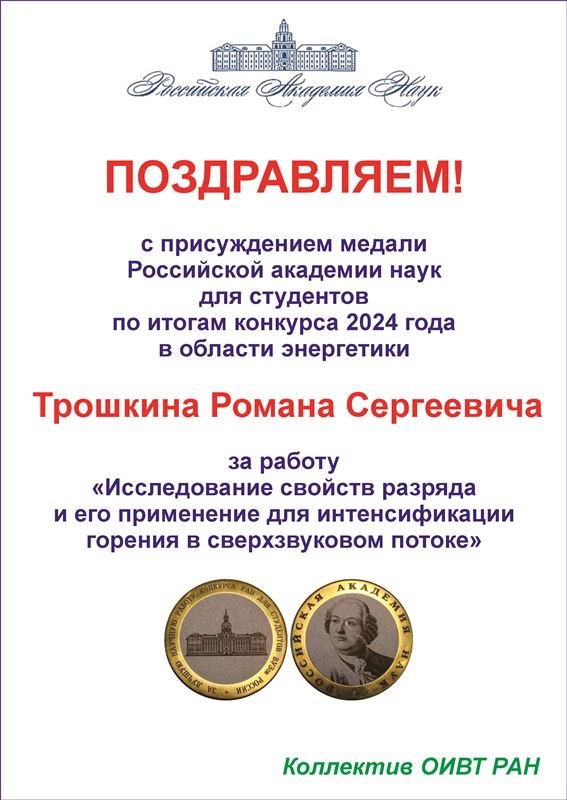 Поздравляем Трошкина Романа Сергеевича с присуждением медали Российской академии наук для студентов по итогам конкурса 2024 года в области энергетики