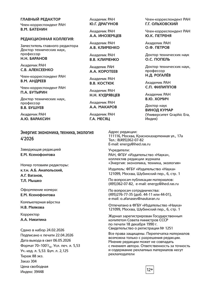 Журнал "Энергия: экономика, техника, экология " № 4, 2026