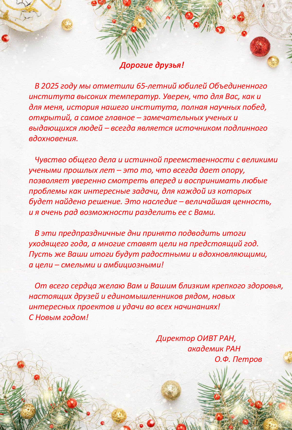 Поздравление директора ОИВТ РАН, академика Петрова О.Ф. с Новым годом