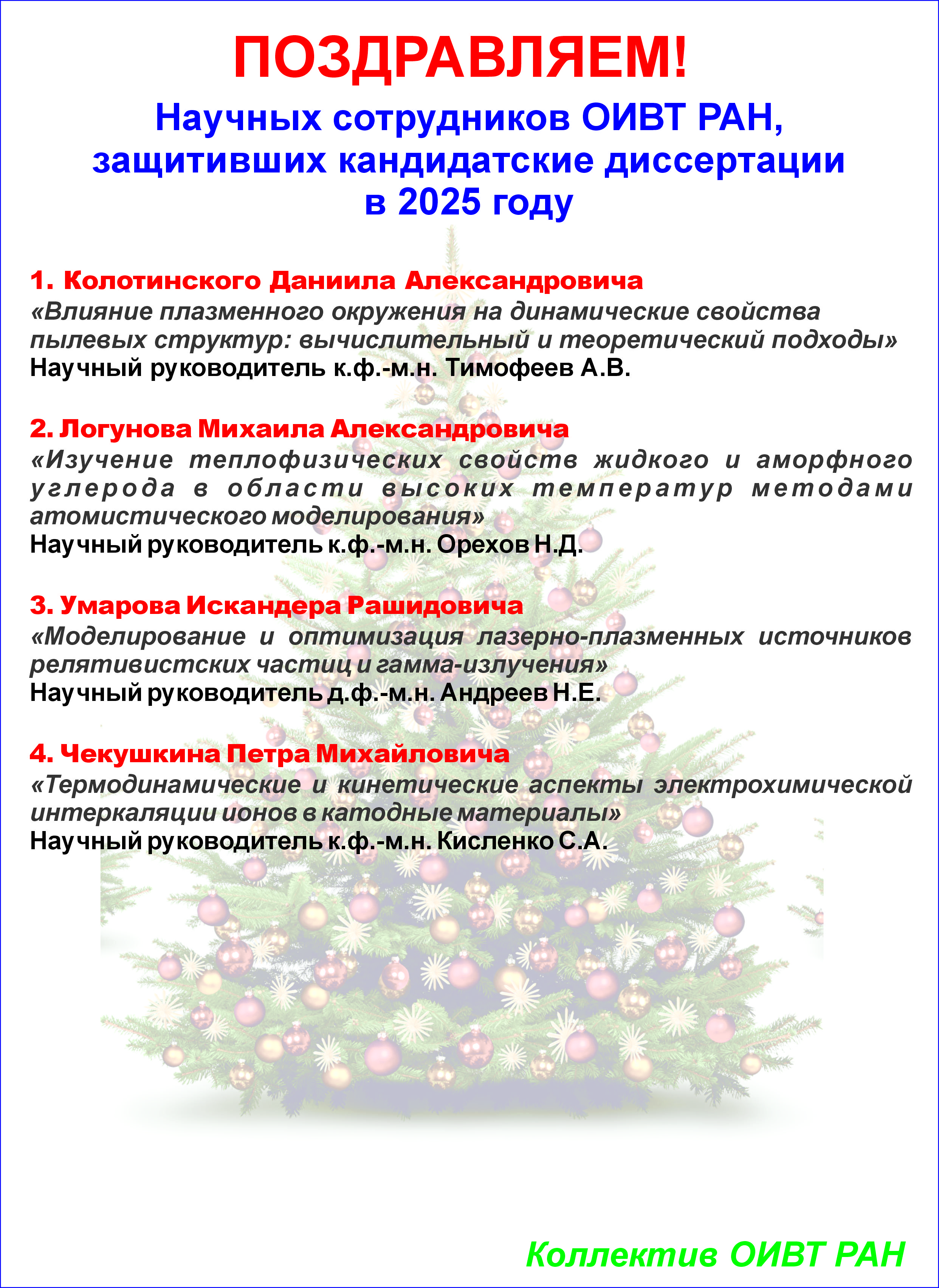 Коллектив ОИВТ РАН поздравляет Научных сотрудников ОИВТ РАН, защитивших диссертации в 2025 году