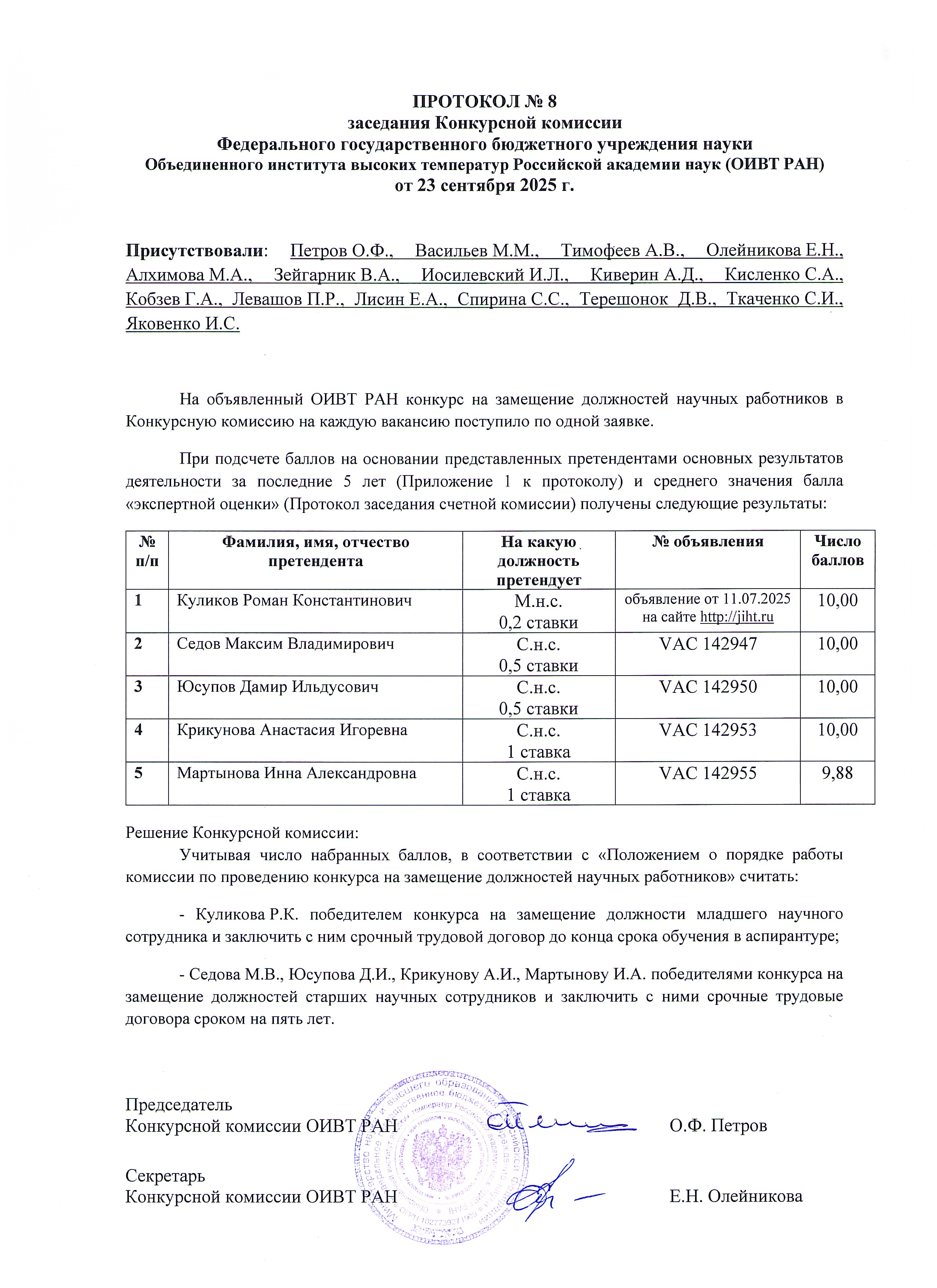 Протокол № 8 заседания Конкурсной комиссии ОИВТ РАН от 23.09.2025 г.